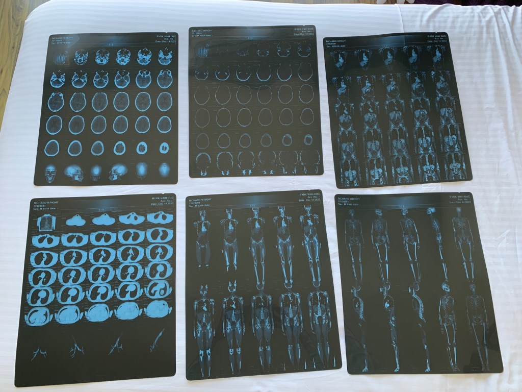 A full body CT scan request is very unusual. It is usually used to either investigate a specific area of the body or else for a general health check in which only the head and torso is scanned. My scan was under the auspices of a general health check and at the end I was handed a CD-Rom of the data, some print-outs and a written health diagnosis – all in Vietnamese. However, I was assured that everything was ‘normal’.