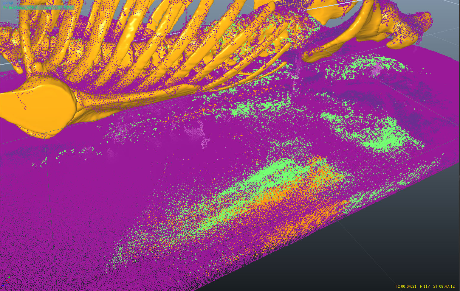 My first experiment was to give each organ a separate particle source, then hope that particles from different sources would interact. In the video you can see the fluids flow together but there is no sense of mixing. If we zoom into the end frame and hide the grey fluid (which comes from the digestive system) we can see it leaves a hole which is what we would expect if the fluids all remain separate.