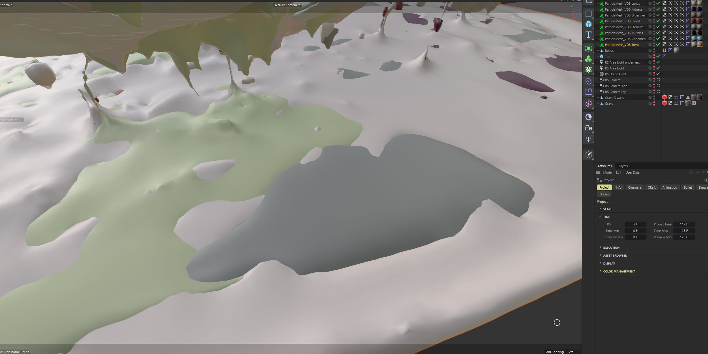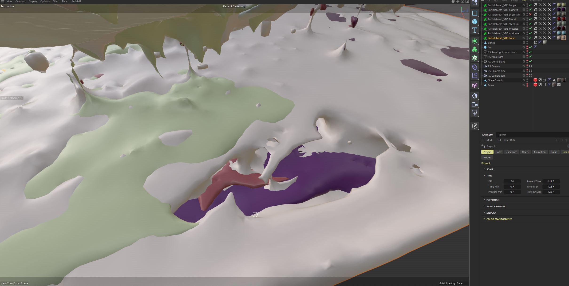 The only solution to the blending problem I could find was to manually edit the degree of blending by remapping the vertex maps. In Cinema 4D Redshift I used a ColorLayer to combine 7 different colours for each organ (this node seems to be limited to 7 layers so only just enough). The colours were masked by the mesh vertex maps but were first fed into a Ramp node. I used the Ramp node to squeeze the vertex map down to nothing at the start of the animation and then keyframed it up to a wider range so that the organ colours gradually appeared. We lost all but 3 of the organ colours and we get a blurring of the fluids like a stain spreading instead of a more complex intermingling. (The organ colours also seemed to swap around). Is this method better than keeping the meshes separate? (I also tried to blend texture maps but perhaps unsurprisingly this did not work – only outputting one set of uv’s for the mesh).