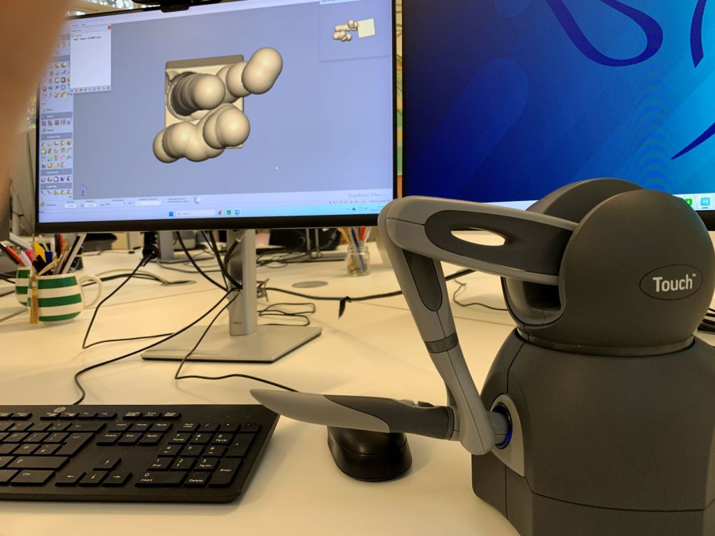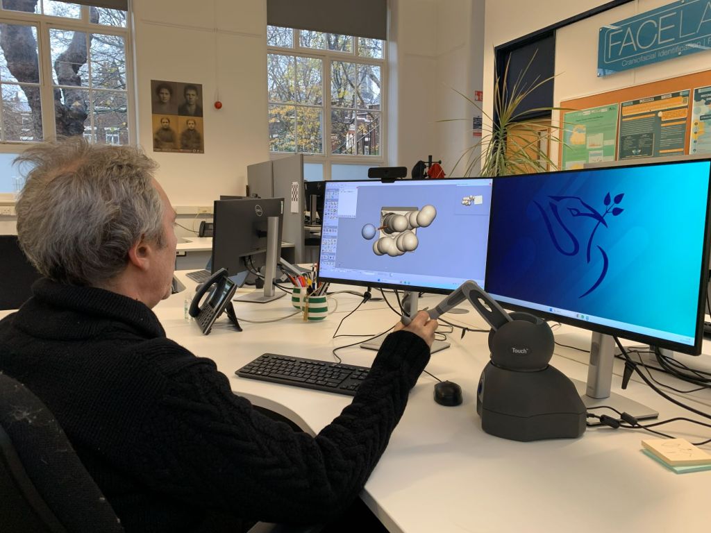 Face Lab employs a 3D modelling programme called Freeform Modelling Plus by Geomagic. This is attached to a Phantom haptic (force-feedback) interface which mimics a manual sculpting process. As you move the stylus it resists your movements as though you have come up against the physical surface of the head, like working in virtual clay. I tried it for a few minutes and found it very unusual. Caroline explained that it takes a while to get used to your hand feeling something that it not where your eye sees it. Then after some practice it suddenly clicks.