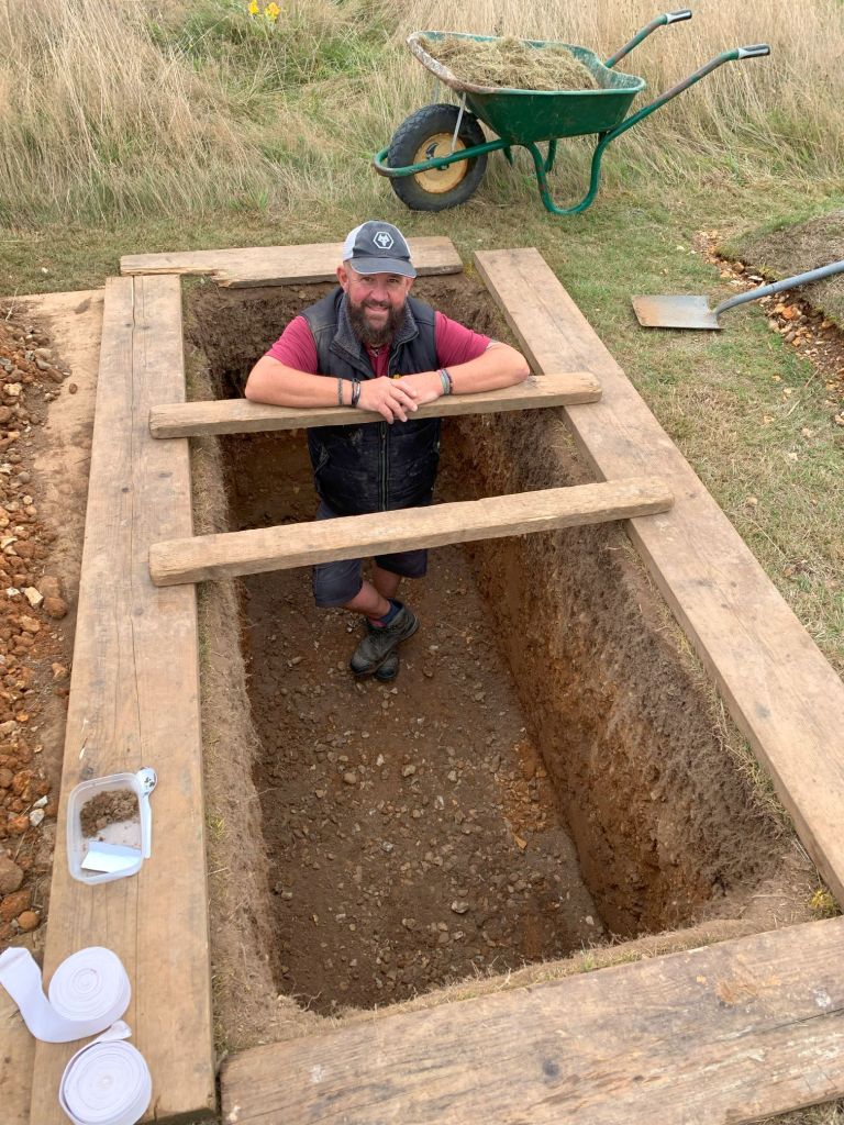 Jonny Yaxley is the grave digger. Here he is ‘dressing the grave’ which involves putting a layer of freshly cut grass on the bottom to create a ‘bed’ for the body. Depending on the time of year it could be flowers or leaves. This is for decorative purposes but the cuttings probably contain small creatures that will effect the decomposition in some way.