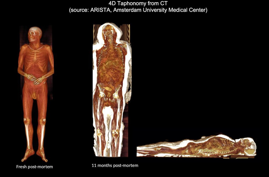 There have been taphonomic research facilities called ‘body farms’ since the 1980s. This image is from ARISTA, a relatively new one in Amsterdam where they have been disinterring dead bodies after 11 and 18 months and CT scanning them. This is the first time that there has been an attempt to empirically record the direct process of human decomposition.